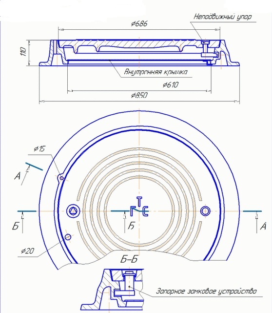 Внутренняя крышка легко вкладывается в корпус люка, а запорная планка  размещается на скобу внутренней крышки и таким образом запирает ее в корпусе люка. В состав конструкции изделия также может входить замок, который обеспечивает защиту от несанкционированного проникновения в колодец посторонних.